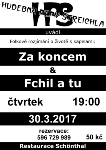 předskokan Kapelám „Za koncem“ a „Fchil a tu“ Václav Fajfr, Za Koncem, Fchil a tu. 30 Mar 2017 Ostrava - Vítkovice Cancelled Details Time : 19.00 hod Venue : Hudebna Pepy Streichla Address : Ruská 78, Ostrava - Vítkovice Phone : 596 729 989